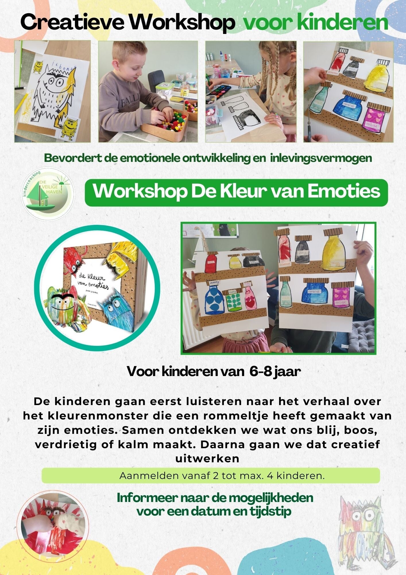 De workshops dragen bij aan het versterken van een positief zelfbeeld en meer zelfvertrouwen, het helpt bij het vergroten van zelfinzicht en het stimuleert op speelse wijze de verbinding tussen de kinderen onderling. De Workshops worden gegeven in de praktijkruimte van Kindercoaching De Veilige Haven in Ermelo en Zeewolde.